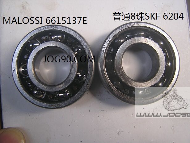 MALOSSI所用的 SKF6204 ETN9/C4比普通的6204有很大区别. 采用 snap-type 材质为 PA66 塑胶和 玻璃纤维強化保持架(胶骨架),磨擦声音更小,即使保持架损坏时,掉在机器里也不会造成严重磨损,尤其适合于齿轮部分,这是这种骨架设计的最主要原因. 由普通6204的8个滚珠变成7个更大的滚珠,能承受更大负荷,寿命更长更可靠.所以同是胶骨架,但7珠的ETN9也要比8珠的TN9更高一个层次.